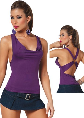 Our Sexy Orchid Purple Sleeveless Top features a sexy cowl neck style with strappy O-ring crossover back and figure flattering shirring.